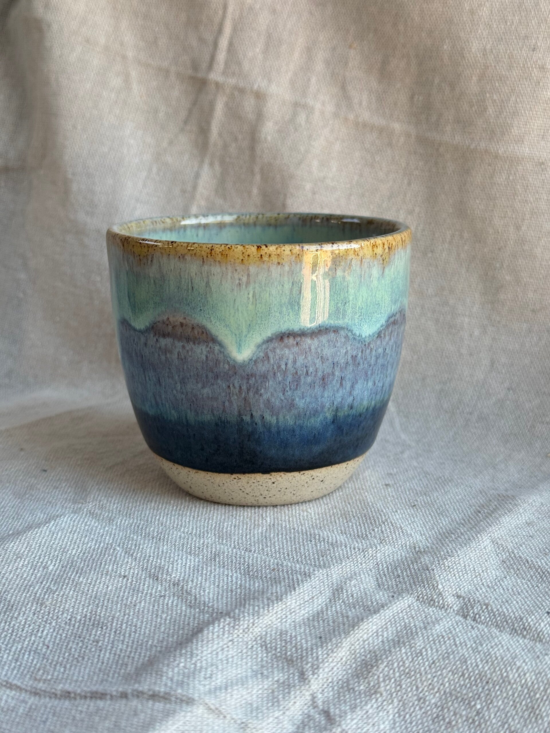 Begin je dag met een moment van rust. Dit mokje uit de Aurora collectie vangt de serene schoonheid van een zonsopgang. De glazuur in diepe blauw- en zachte minttinten vloeit over elkaar, net als de horizon bij het krieken van de dag. De onderkant is ongeglazuurd en getextureerd, waardoor het een aardse en unieke uitstraling krijgt.