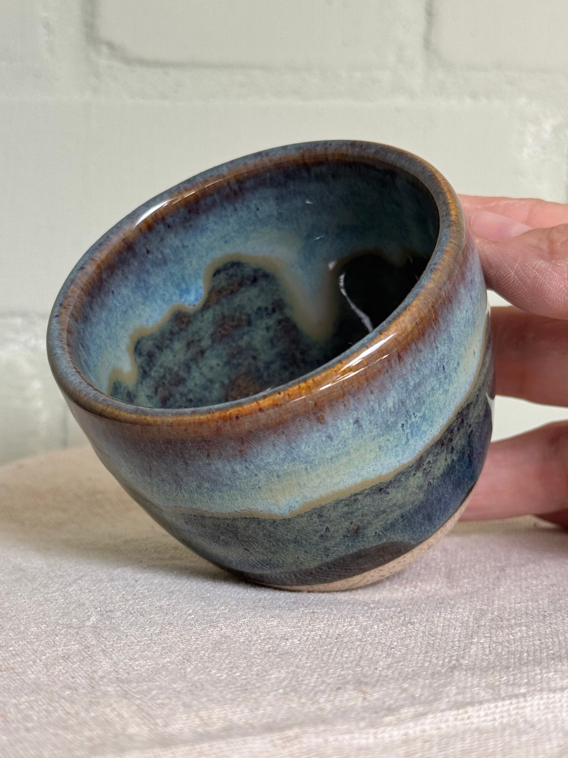 De unieke glazuurlaag, geïnspireerd op mistige berglandschappen, verandert elke mok in een uniek kunstwerk. De diepe, aardse tinten van bruin en blauw, gecombineerd met een vleugje crème, zorgen voor een serene en rustieke uitstraling.