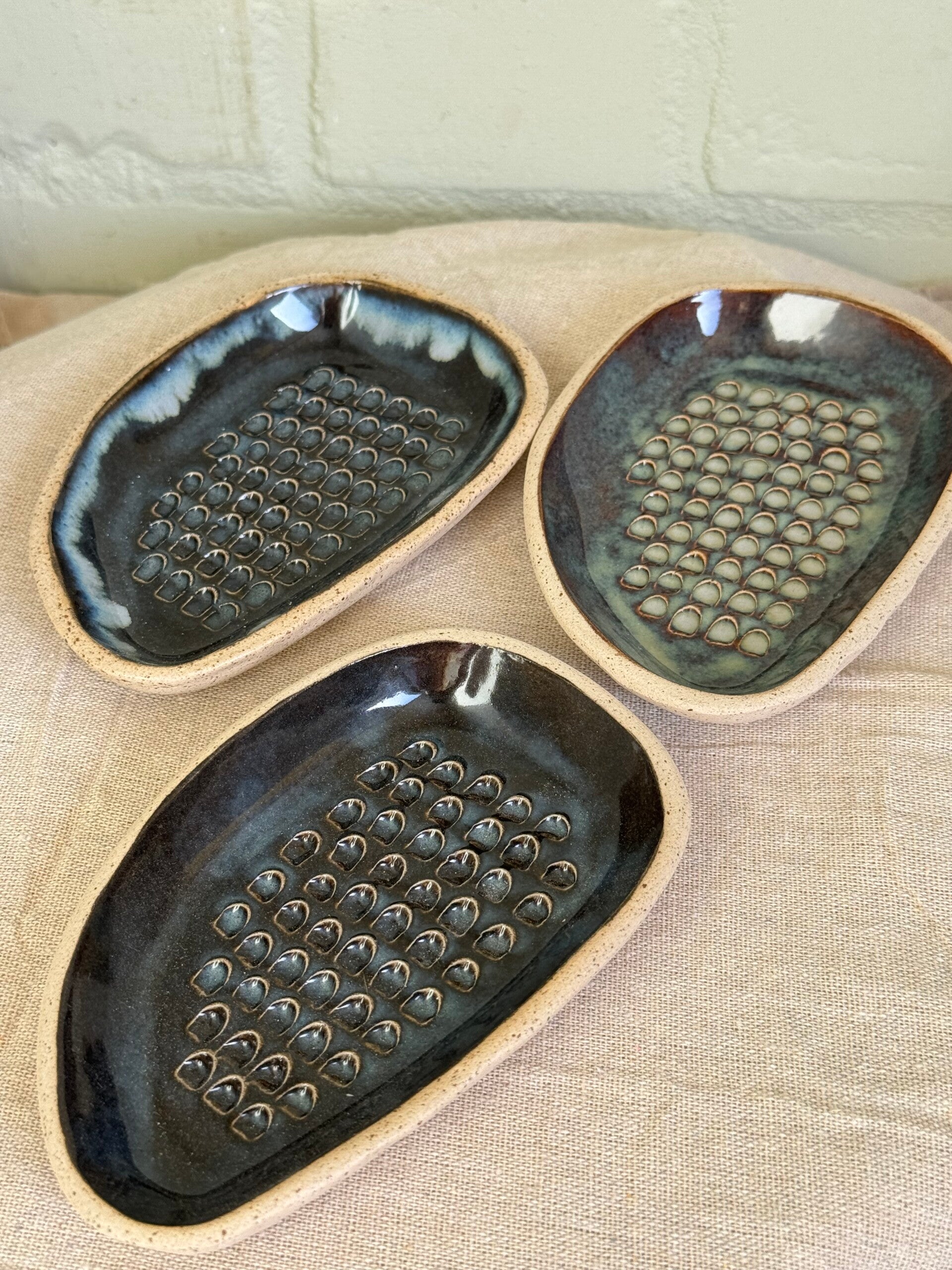 Kook met plezier met dit prachtige handgemaakte raspbordje. Met zijn unieke, organische vorm en het diepe, donkere glazuur is dit bordje een waar kunstwerk. De glanzende, puntige nopjes zijn niet alleen mooi, maar ook uiterst functioneel: rasp moeiteloos knoflook, gember, nootmuskaat of kruiden direct in het schaaltje.