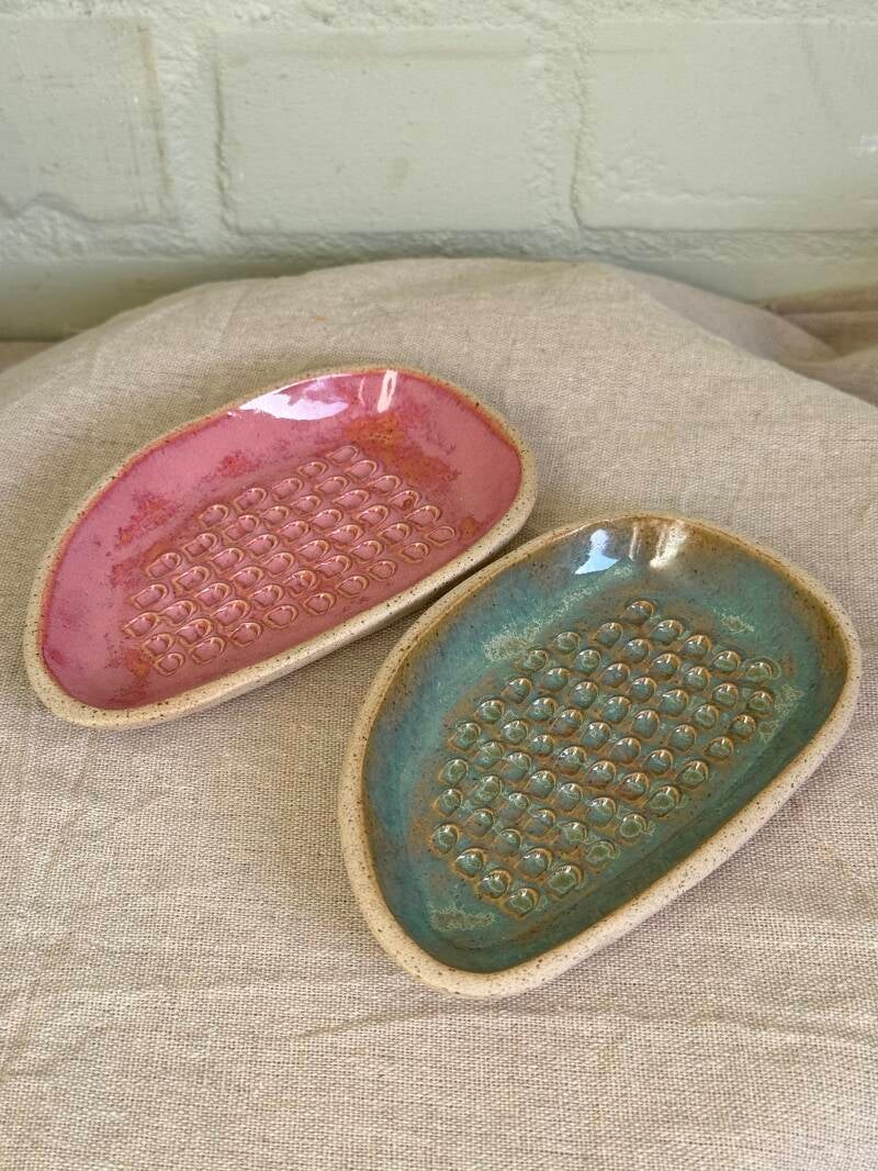 Kook met plezier met dit prachtige handgemaakte raspbordje. Met zijn unieke, organische vorm en het rustieke, groene glazuur is dit bordje een waar kunstwerk. De glanzende, puntige nopjes zijn niet alleen mooi, maar ook uiterst functioneel: rasp moeiteloos knoflook, gember, nootmuskaat of kruiden direct in het schaaltje.