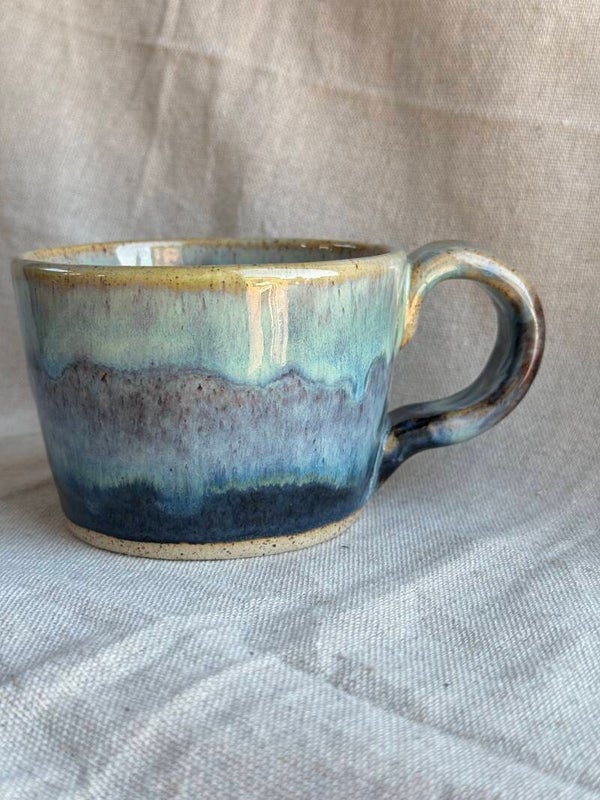 Begin je dag met een moment van rust. Deze mok uit de Aurora collectie vangt de serene schoonheid van een zonsopgang. De glazuur in diepe blauw- en zachte minttinten vloeit over elkaar, net als de horizon bij het krieken van de dag. De onderkant is ongeglazuurd en getextureerd, waardoor het een aardse en unieke uitstraling krijgt.