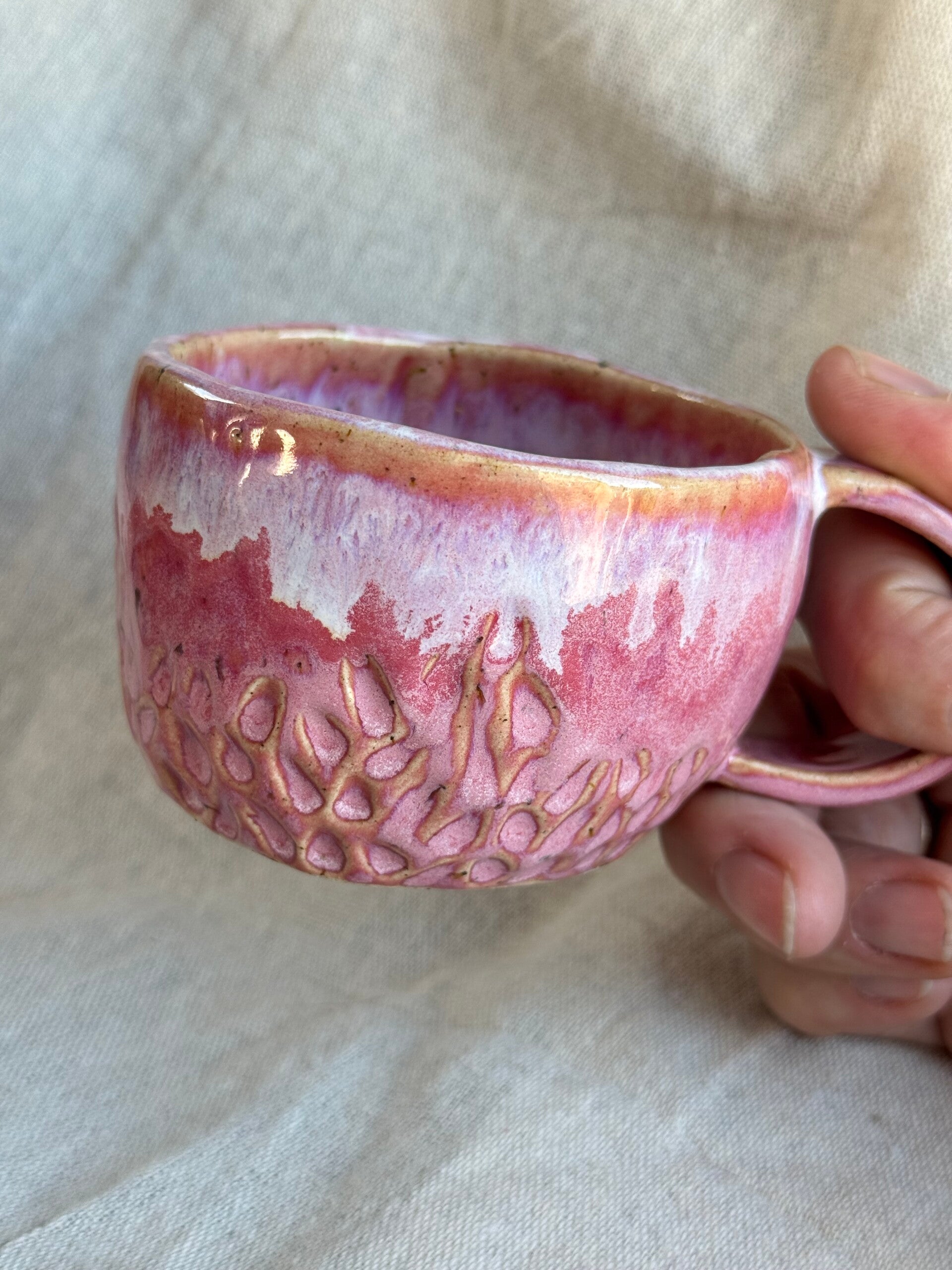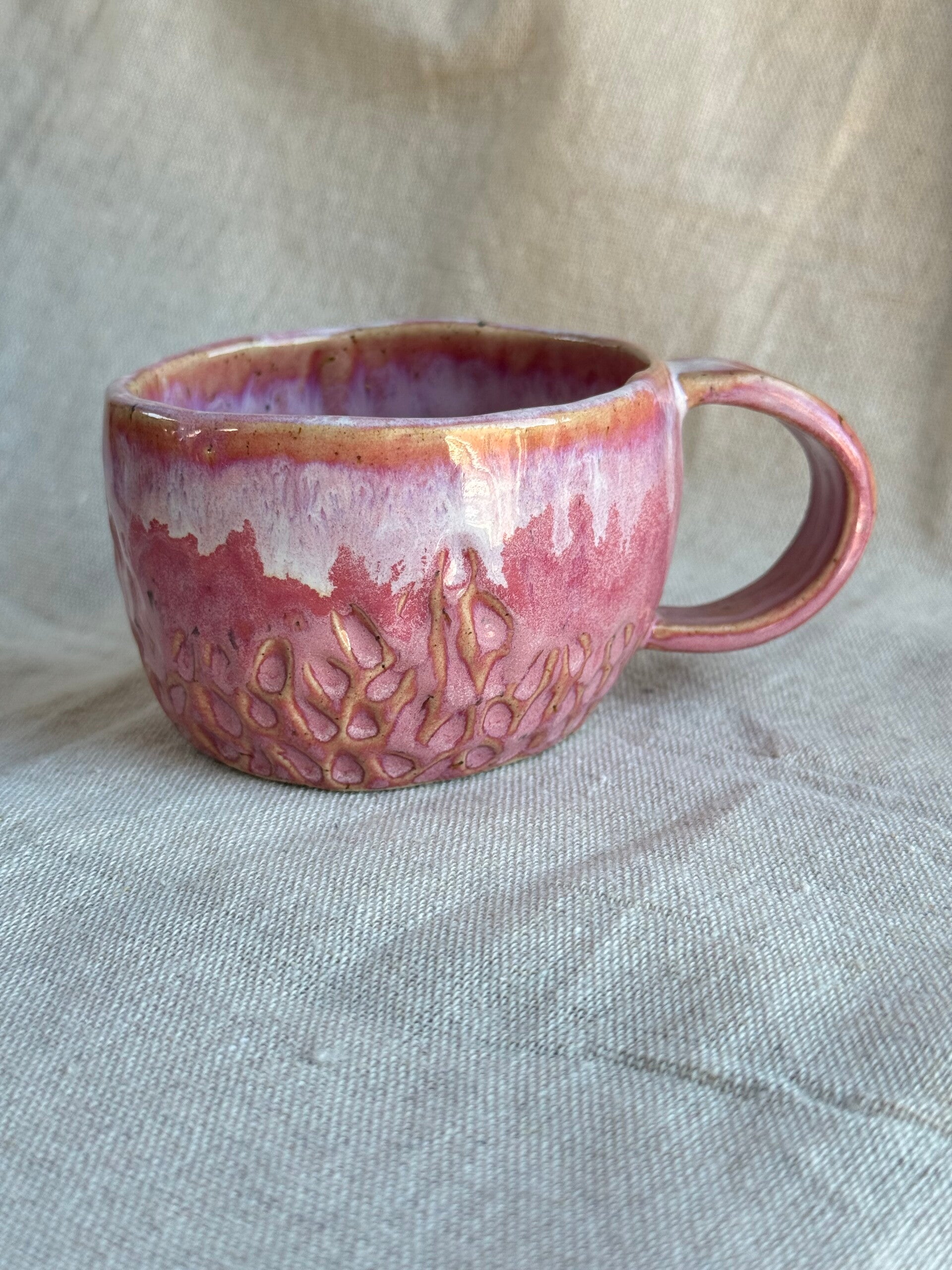 De buitenzijde is voorzien van een unieke, uitgesproken reliëftextuur, die een stoere uitstraling geeft en tegelijkertijd een uitstekende grip biedt. De glazuur is een sprankelende combinatie van diep fuchsia/roze en iriserend wit, waarbij de witte glazuur prachtig over de rand naar beneden druipt. De levendige roze tint maakt van elk slokje een kleurrijke ervaring.