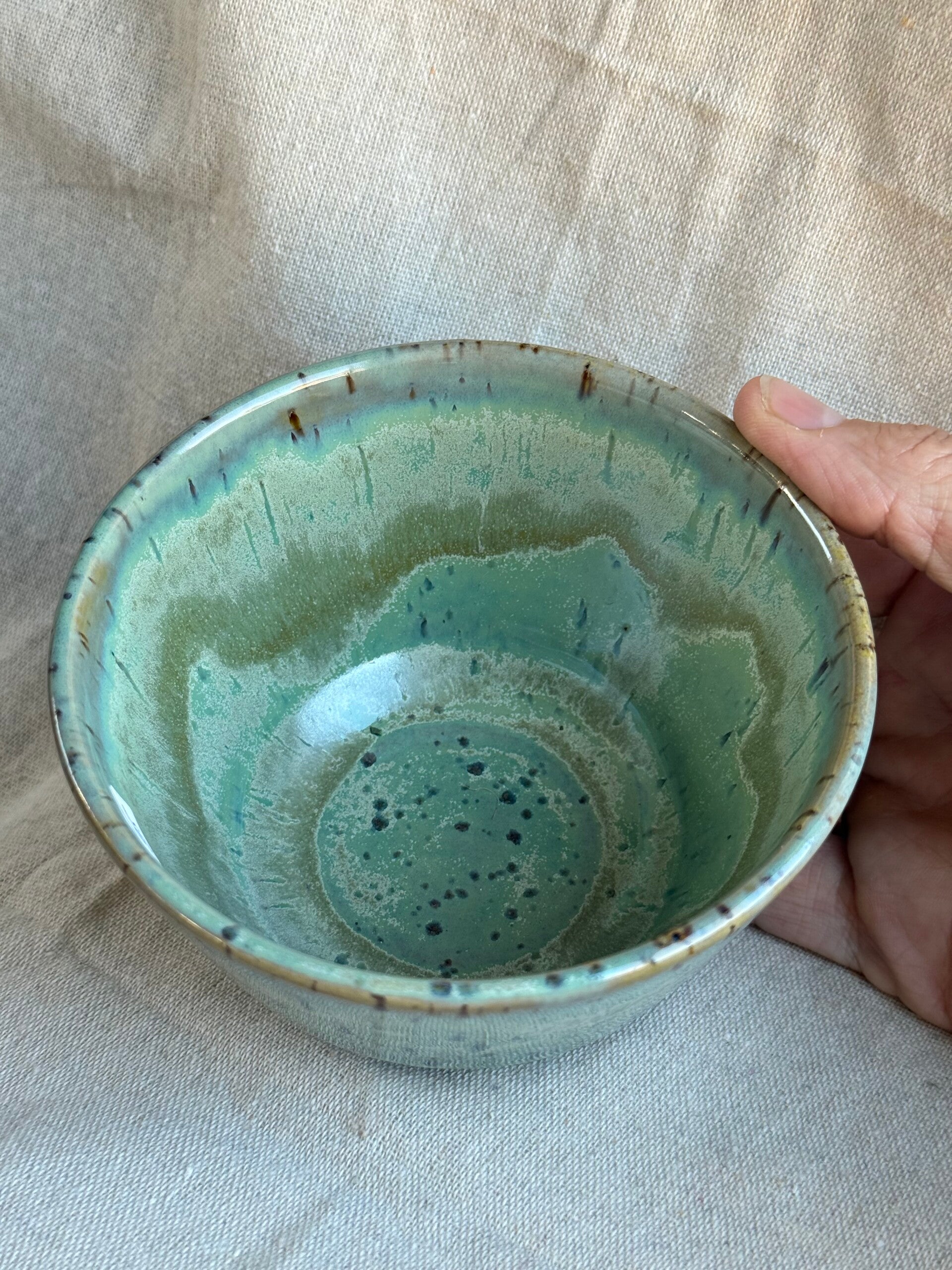 De kom is afgewerkt met een schitterende reactieve glazuur in een levendige tint van zeegroen/mint, met natuurlijke bruine accenten langs de rand en in de diepte. De binnenkant heeft een lichte, gespikkelde afwerking die het handgemaakte karakter benadrukt.