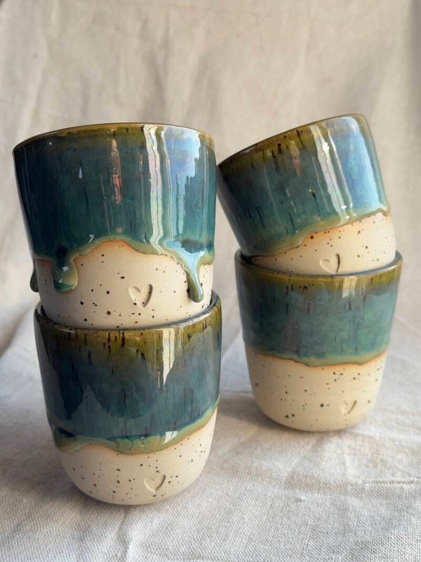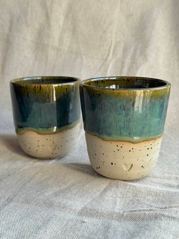 Dit charmante kopje is met de hand gemaakt van gespikkelde klei en afgewerkt met een schitterend, diep groenblauw 'drip' glazuur. De subtiel ingedrukte hartvorm maakt elk stuk extra bijzonder. Perfect voor je dagelijkse espresso, sterke thee of als unieke blikvanger.