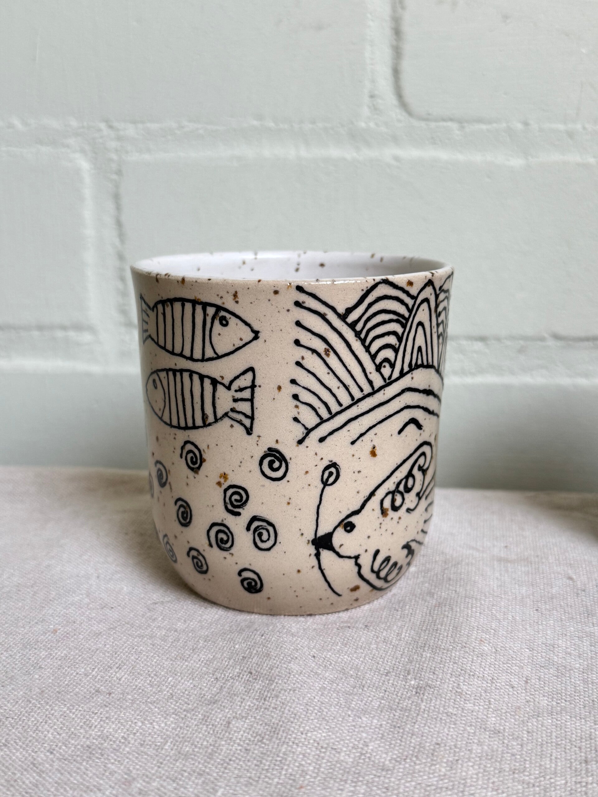 Geniet van je drankje terwijl je de beker draait! Deze handgemaakte mok is rondom getekend met een vrolijke en fantasierijke grafische wereld van speelse patronen.
