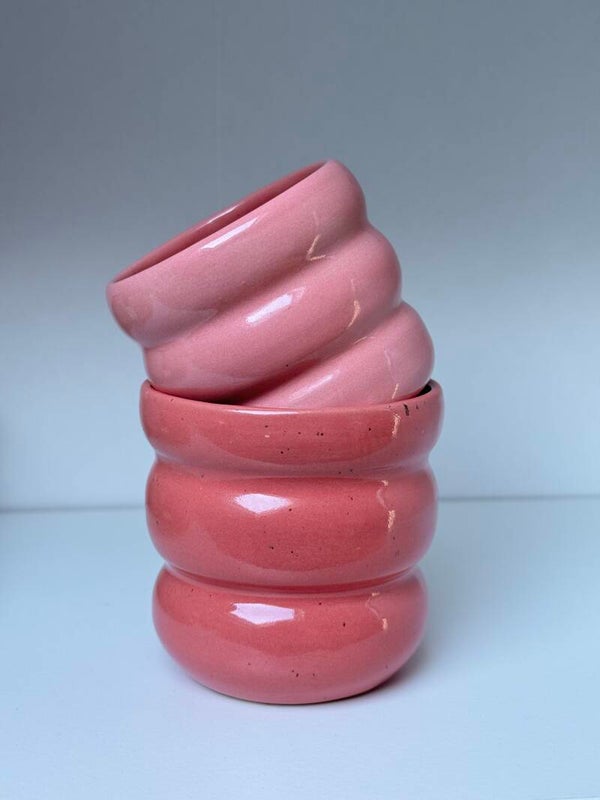 De Bubble mug de grotere versie van de cup is puur plezier in je handen. Met haar ronde, speelse vorm en zachte lijnen en pastel kleur ligt ze comfortabel in de hand en maakt ze van elke cappuccino of latte een klein genietmoment. (spikkel klei)