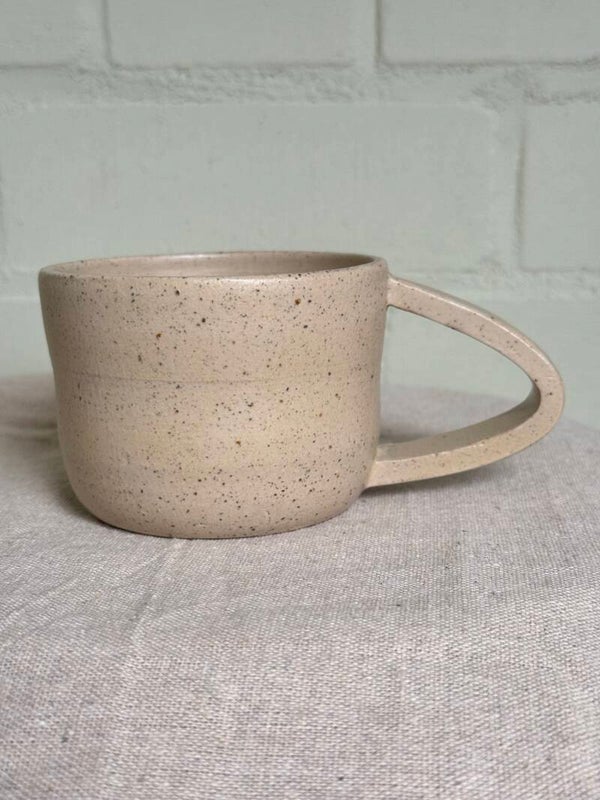Ontdek deze prachtige, handgedraaide koffiekop met oor. Met zijn zacht gebogen vorm en perfect gebalanceerde gewicht ligt hij heerlijk in de hand. Het glazuur voelt zijdezacht aan.